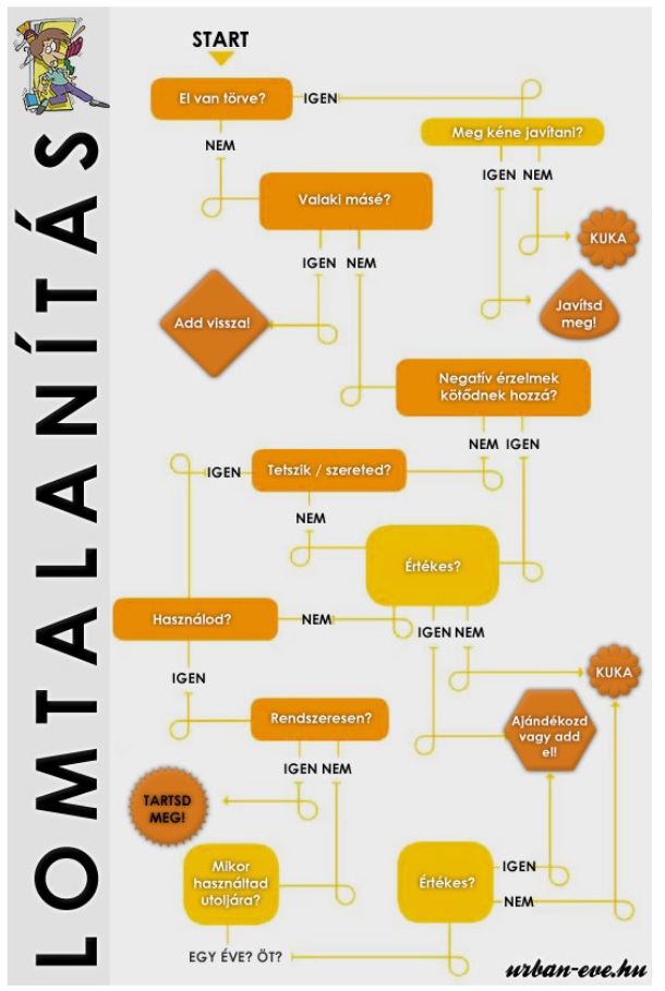 szerint napi 15 percet szelektálok, az én olvasatomban lomtalanítok. A lomtalanítás számomra nem (csak) arról szól, hogy a lejárt szavatosságú gyógyszereket elviszem a patikába, kidobom a törött játékokat, amit úgysem fog soha senki megjavítatni, hanem arról (is) hogy a még jó, használható, de általunk nem használt tárgyakat is lomként tekintem. Egy jó lomtalanítási séma letölthető innen: