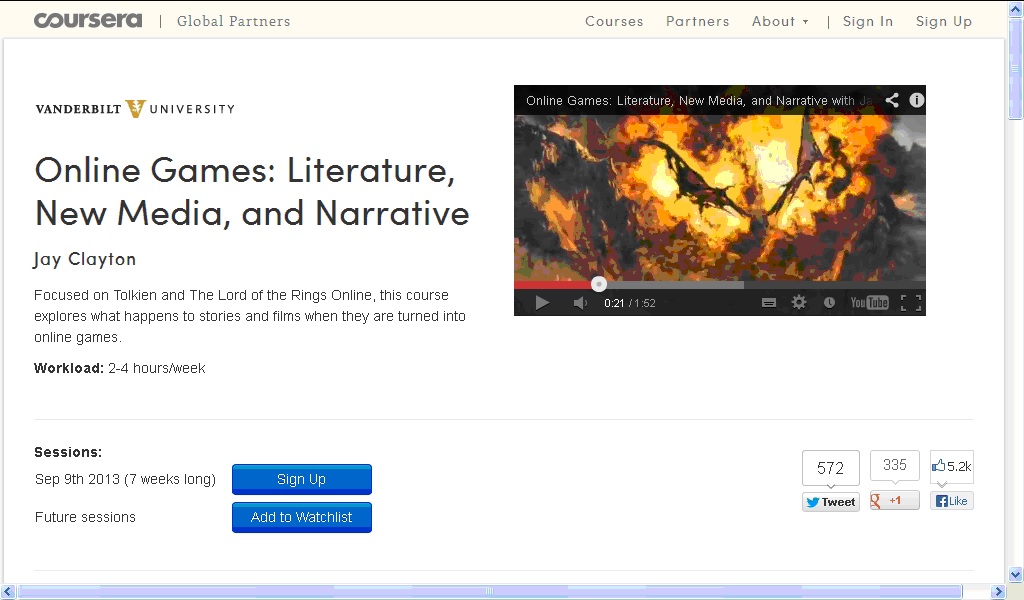 A https://www.coursera.org/ jóvoltából neves egyetemek és felnőttképzési intézetek kurzusainak lehetünk interaktív részesei. A Yale, Stanford, Princeton, Columbia és számos más amerikai egyetem mellett a koppenhágai, melbourni, jeruzsálemi vagy éppen tokiói egyetem előadásait hallgathatjuk, a New York-i Modern Művészetek Múzeumának szakembereitől szerezhetünk inspirációt. A kurzusok túlnyomórészt angol nyelvűek, néhány spanyol, kínai, olasz és francia kurzust is hirdetnek. 25 különböző kategóriában összesen 390 különböző tanfolyamon vehetünk részt, néhány téma ízelítőül: „Algoritmusok: tervezés és elemzés” (Stanford), „A Római birodalom építészete” (Yale), „Bevezetés a nyilvános beszéd technikájába” (Washingtoni Egyetem), „Online játékok: irodalom, új média és narratíva” (Vanderbilt).