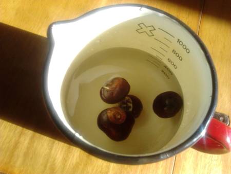 Előkészítés: Beáztatjuk a gesztenyéket. Egy mosáshoz 4 darabot. 20 perc múlva, amikor már megpuhult a külső héj, késsel meghámozzuk. Nem olyan nehéz, mint amilyennek kinéz. A gesztenyéket ezután lereszelem (bár van, aki csak összevágja). Öntök rá 2 dcl forró vizet, majd a levet egy mosózsákon keresztül a mosógépbe szűröm. Vagyis a habzó lé a mosógépbe kerül a gesztenye reszelék meg a mosózsákba. Mosózsákot bekötöm, beleteszem a mosógépbe és indulhat a mosás.